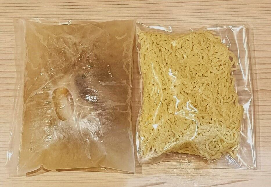 ④ 茹で上がった麺と解凍したスープを器に盛り付けて出来上がり。
