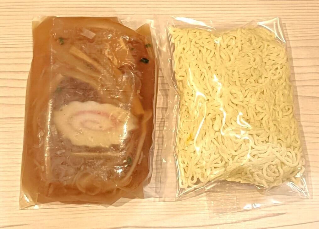 ④ 茹で上がった麺と解凍したスープを器に盛り付けて出来上がり。